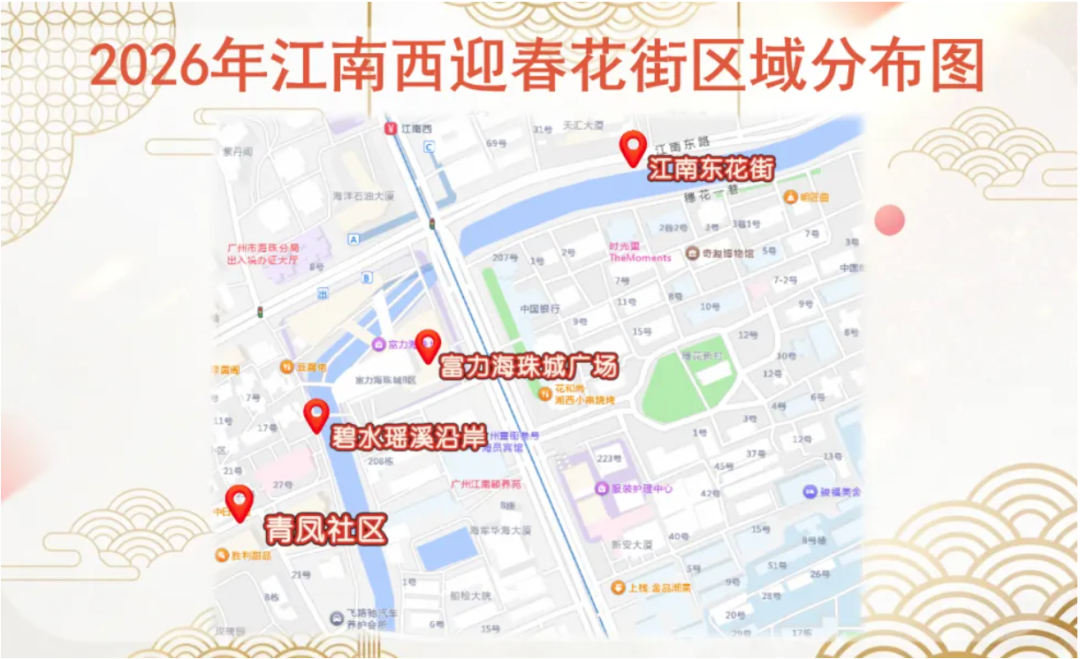 亮点:2026年江南西迎春花街整合江南东花街、富力海珠城、瑶溪花市(青凤社区)三大区域,精心绘制动态游览图。此外,花街还全面升级,潮流玩法+硬核福利双在线。